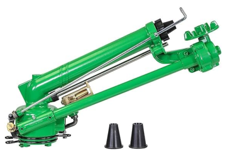 Is a middle discharge sprinkler for high-pressure systems, rotating at auniform speed over afull or part circle. Equipped with interchangeable nozzles of different size and an adjustable breaker providing an uniform distribution of rain all over an irrigated area.