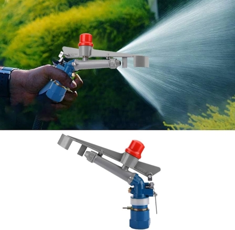 A sprinkler for high pressure systems, rotating at auniform speed over afull or part circle. Has an adjustable breaker providing an uniform distribution of rain all over an irrigated area.